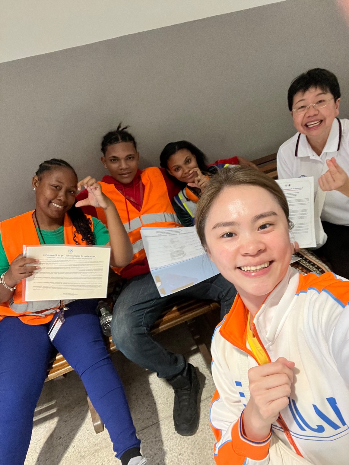 2024年她跟隨親訪團拜訪被金氏世界紀錄認證為全球最大學校、印度勒克瑙的「城市蒙特梭利學校」(CMS),參與「城市蒙特梭利學校」所舉辦的「全球首席大法官國際會議」,推動愛與和平、良心時代運動。她擔任青年論壇主持人並分享跨越國界創造愛與和平橋樑的觀點,與現場教師、學生交流,令她印象深刻。2025年跟隨親訪團拜訪「和平之國」汶萊,傳遞愛、和平與良心的善的訊息。