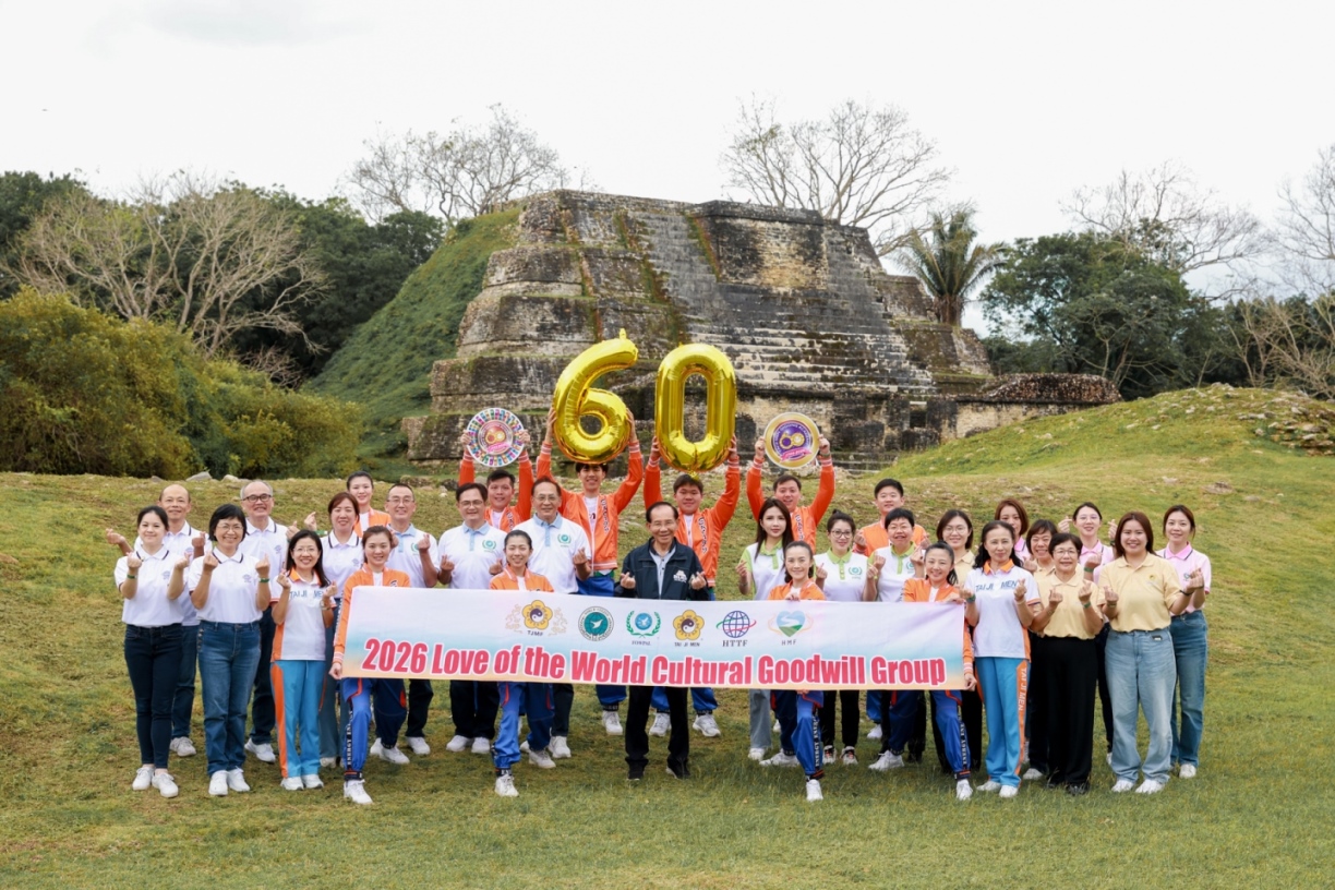 貝里斯也是古馬雅文明的重要核心區域,全境擁有超過1,400處已記錄的遺址,包括聚落、金字塔、祭壇與觀星台等。1月15日下午,親訪團前往知名馬雅遺址阿爾頓哈(Altun Ha),在馬雅語中意為「石頭水」,此處以出土翠綠的「太陽神頭像」玉雕聞名。該遺址在西元前200年,曾是重要的宗教與貿易中心。團員們登上壯觀的太陽神祭壇,手持象徵太極門氣功養生學會六十週年的金色「60」氣球,為揚善百國寫下歷史新頁。親訪團成員馬小蘭表示,馬雅文明的興盛源於長時間的累積、族群的團結與分工合作;然而當貪念與戰爭興起,再輝煌的文明也終將消逝。站在遺址前,她反思當代人類也正站在關鍵抉擇點上一一選擇戰爭,或許是終結文明的開端;而選擇和平,才能為人類留下延續的希望。