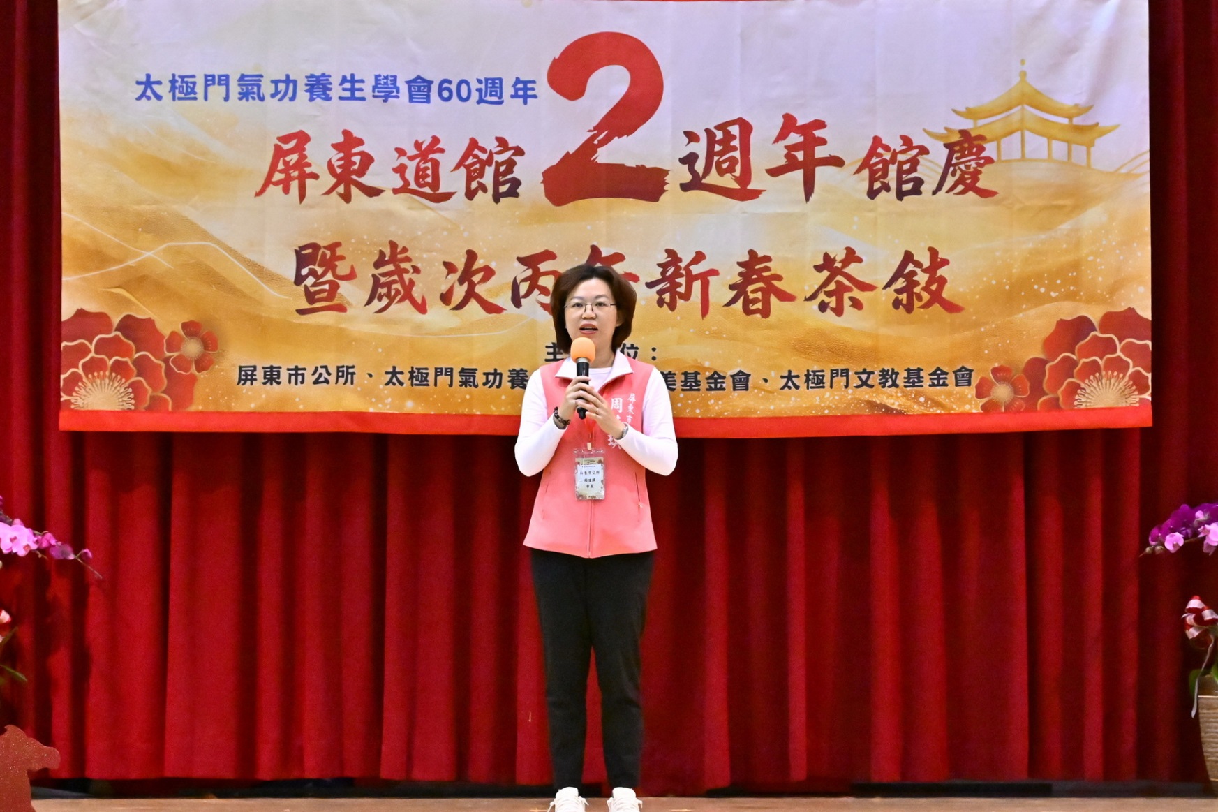 屏東市長周佳琪指出,太極門氣功養生學會走過一甲子,弟子們修練氣功,傳承愛、善良、希望,走過120多個國家,發揮影響力,促使全世界朝向和平、共榮、共生、共好發展,每一個人都平安、健康、快樂!她非常開心,屏東道館成立了兩週年,在市公所舉辦的新春活動,讓大家在新的年度充滿活力、奔騰向前!