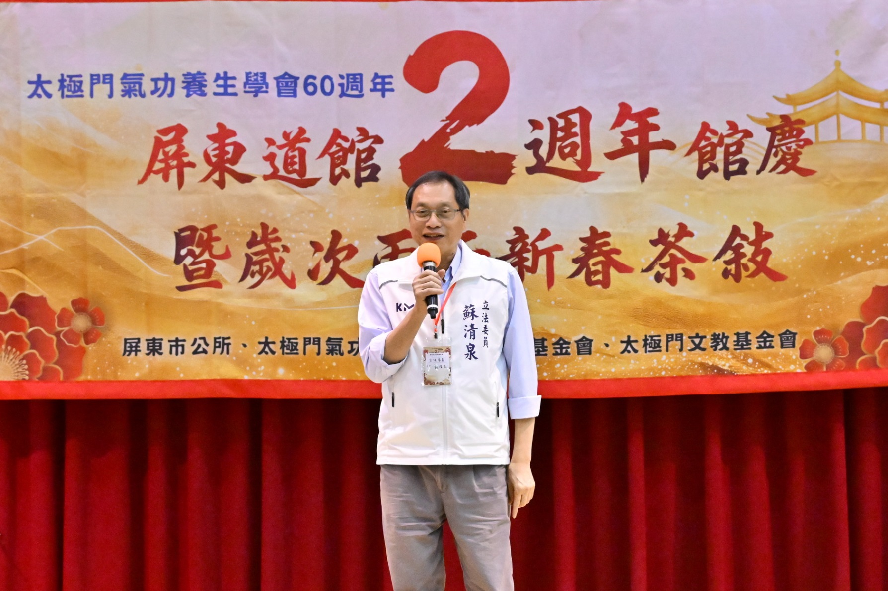 立委蘇清泉表示,太極門氣功養生學會真的很棒,老中青都有,發揚人與人之間善良的一面,讓社會更和諧。新的一年,他祝大家馬上幸福、馬上健康。