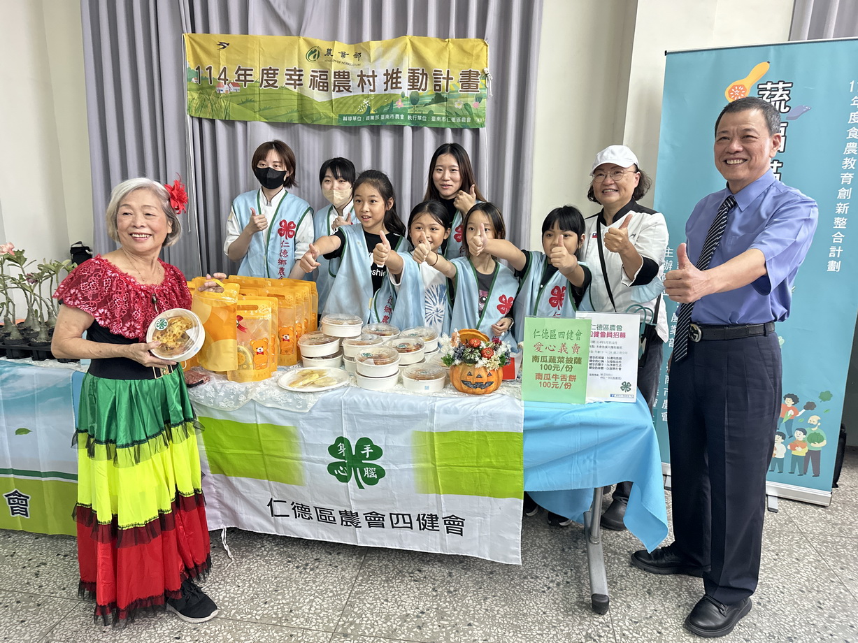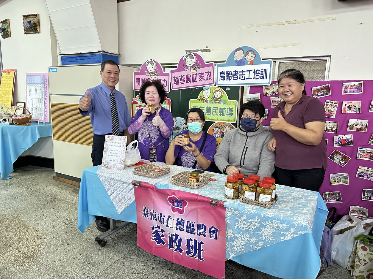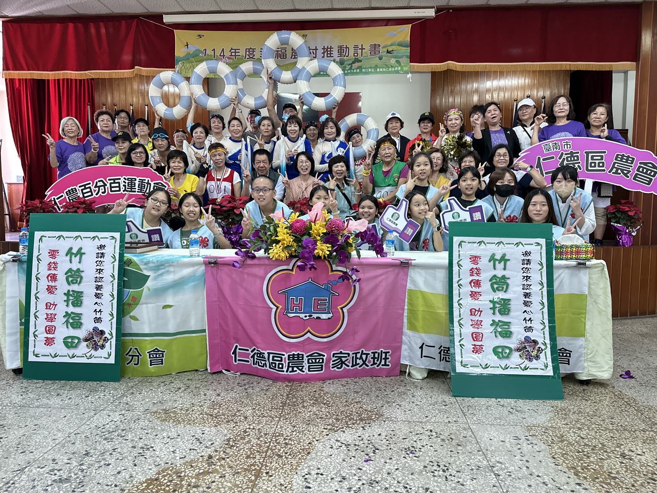 北台南家扶主任李桂平,今年欣逢仁德農會創會100週年,仁農千歲團成員由25位平均70歲以上的阿公阿嬤,總齡1759歲以「仁農百分百運動會」勁歌熱舞充滿活力的舞蹈方式作為祝賀,另外仁德區農會家政班婆婆媽媽們更是深具愛心,除最先的認養竹筒外,亦主動推出紅包助學的構想,近年來四健會會員、青年農民及家政班成員亦陸續加入「您買,我捐」義賣愛心行列,現場提供南瓜牛舌餅、南瓜蔬菜披薩、手作豆腐乳、椒麻堅果醬、黃金泡菜、冬瓜露、幸福坊異國料理、多肉組合盆栽、健康小番茄、天然蘆薈手工皂及肩頸紓壓送愛心…等進行義賣,所得亦全數捐作家扶歲末寒冬計劃助學金之用。