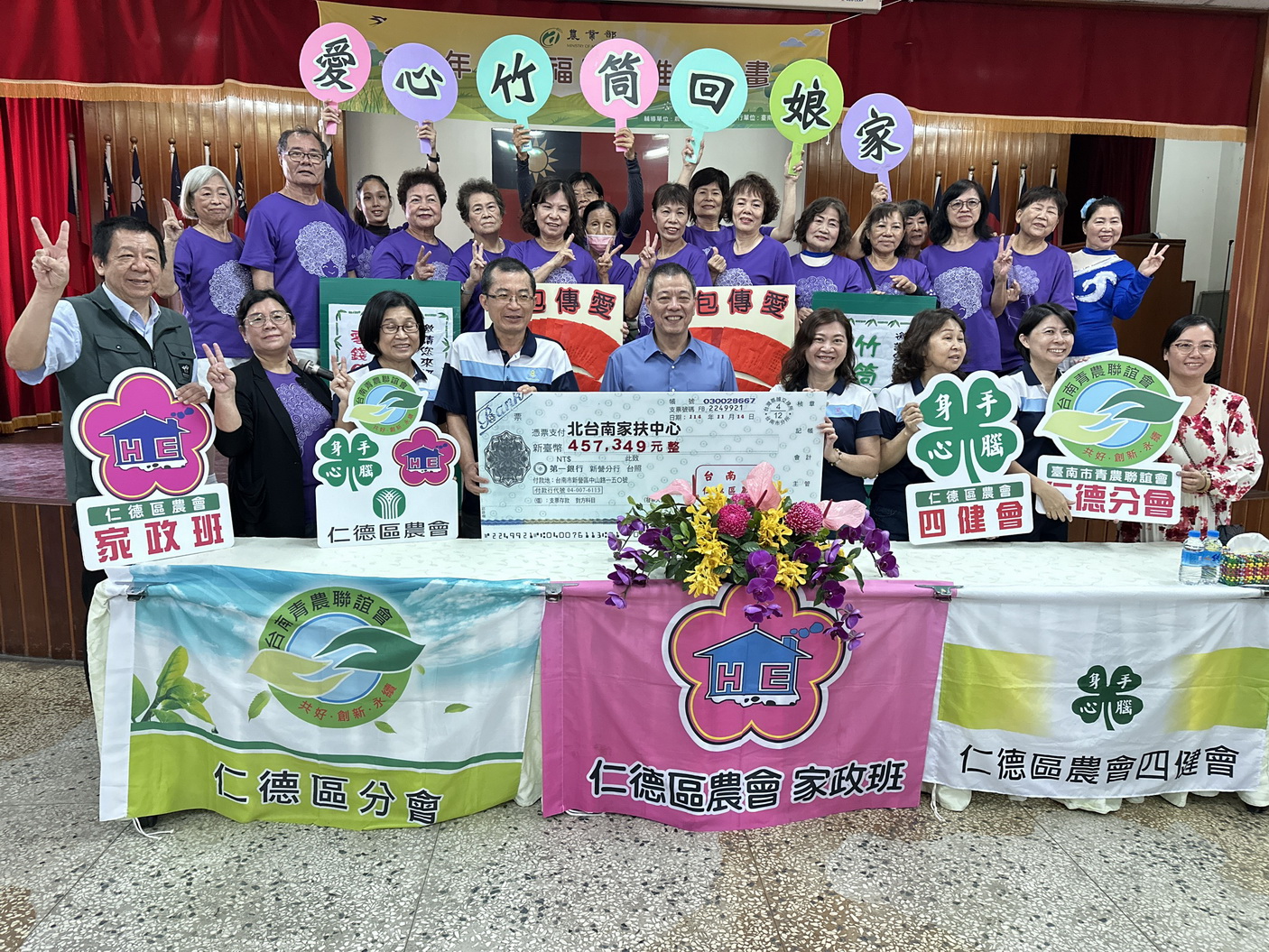 【記者邱仁武/台南報導】「仁德農會傳愛20載!承先啟後感恩有您」!台南市仁德區農會14日在農會三樓辦理幸福農村計畫推廣教育三部門聯合成果展暨愛心竹筒回娘家活動,農會總幹事曾佳哲率先捐出1萬元紅包帶領下,農會員工熱情響應及家政班一群深具愛心的婆婆媽媽們再度剖竹筒送愛心,活動現場溫馨熱鬧,見證了20年來仁德農會與北台南家扶中心共同攜手的感人故事,經清點裝滿零錢的竹筒27支共獲80,544元,而婆婆媽媽們也紛紛掏出紅包捐贈,共171個獲302,755元響應北台南家扶即將於12月07日辦理的『寒冬送暖』活動,現場加上青農、家政、高齡及四健會聯合義賣款72,050元,總計捐贈455,349元,而累計20年來仁德農會愛心捐款已高達350萬餘元。