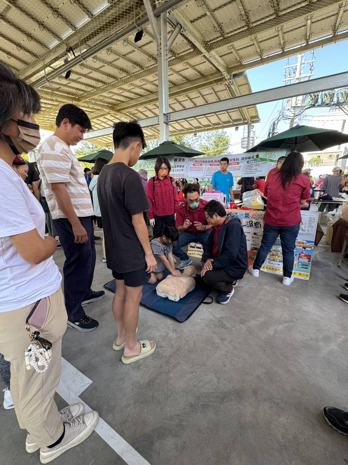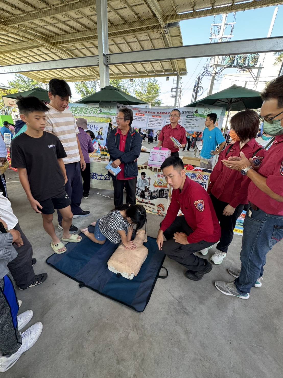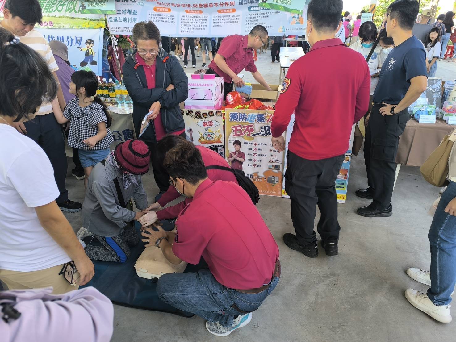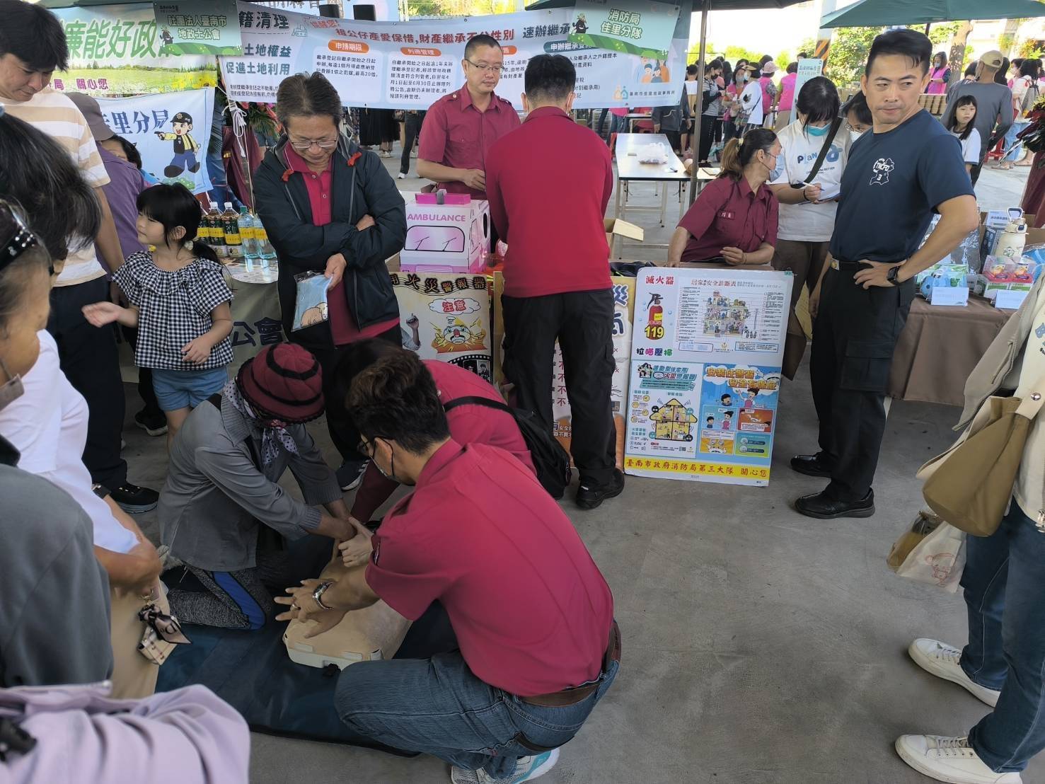 活動最受歡迎的區域莫過於 CPR 體驗區,消防員一步步教導民眾如何掌握壓胸位置、頻率與深度,並用節奏口訣「快、快、壓」讓民眾快速上手。