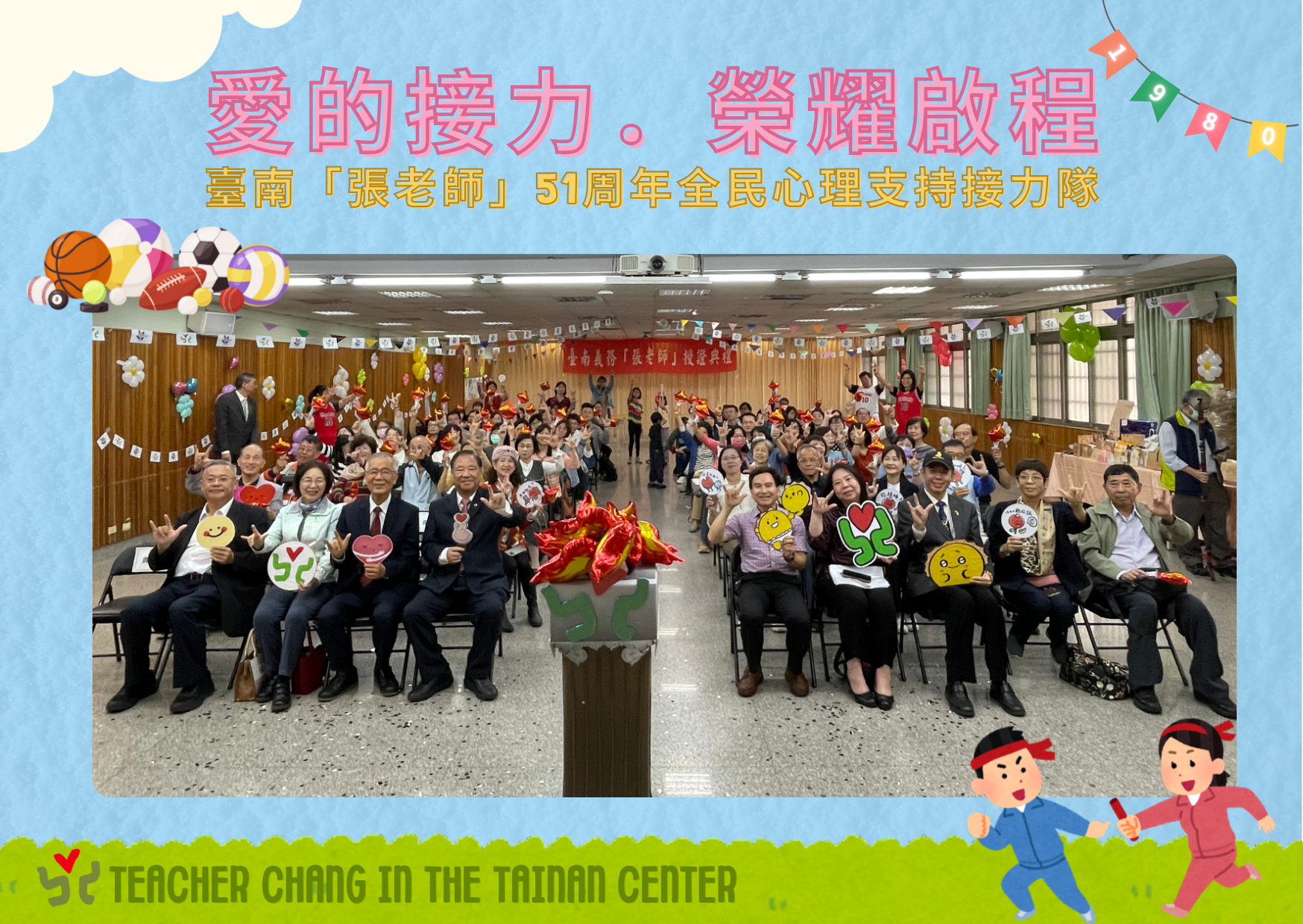 董事長葛永光表示,臺南「張老師」成立51 年來服務青少年無數,但近年台灣正面臨超高齡社會,有1/4人口為 65 歲以上銀髮族,也因應疫情快速轉型線上化服務,服務對象逐漸邁向全齡化心理服務。因此,提倡「張老師」三大願景,讓愛跑得更長、更遠。