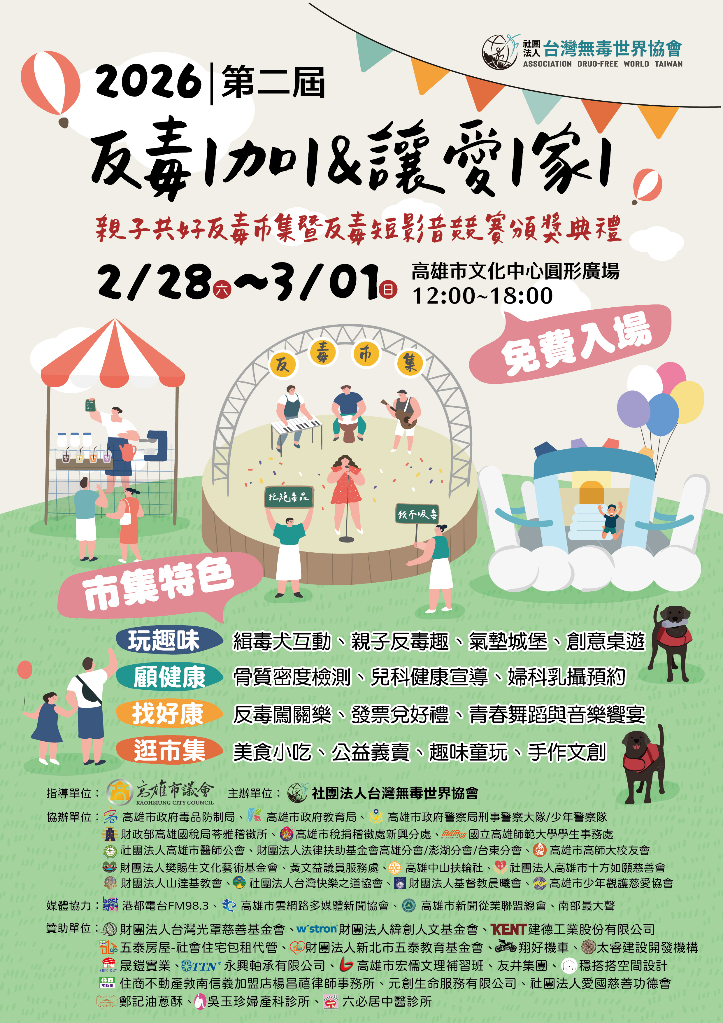 開春最大規模的反毒盛事即將登場!由社團法人台灣無毒世界協會主辦、高雄市議會指導的「第二屆反毒 1 加 1 & 讓愛 1 家 1」親子共好公益市集,將於 2 月 28 日至 3 月 1 日在高雄文化中心圓形廣場盛大舉行。今年規模全面升級,攤位翻倍至 100 攤,並聯合高市府毒防局、教育局、警察局等多個局處協辦,在面對新興毒品多樣化的趨勢下,透過跨部門公私協力,築起最堅實的社會安全網。