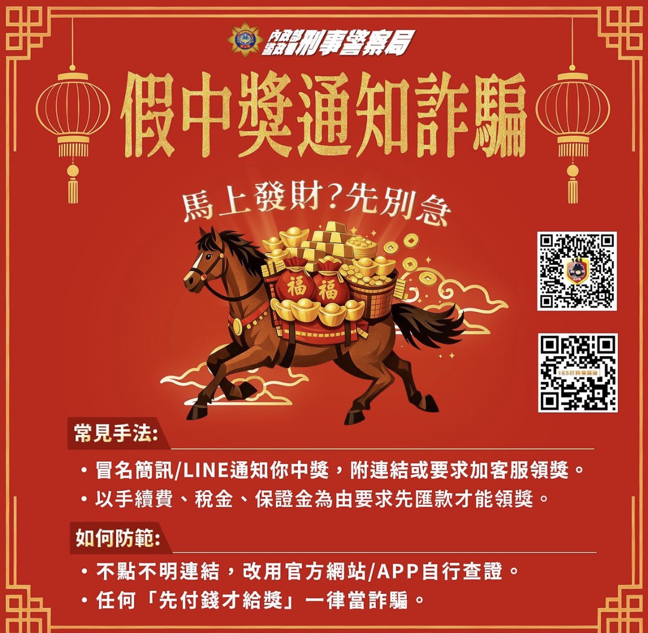 馬上發財?先別急 新年想「馬上發財」,最怕卻是「馬上被詐財」!近期常見假中獎通知詐騙,冒用簡訊或LINE告知你中大獎,附上連結或要求加入客服,接著以手續費、稅金、保證金為由,要你先匯款才能領獎。記住凡是「先付錢才給獎」一定是詐騙! 過年期間詐騙更活躍,別因為一時開心就點擊不明連結。請改用官方網站或APP自行查證,有疑問可撥打165反詐騙專線。 新的一年,祝大家平安發財、荷包滿滿,不讓詐騙來攪局! 假中獎通知詐騙 #165、過年、防詐、馬上發財。