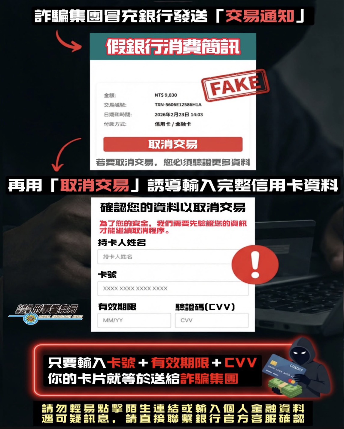 假取消交易通知,真盜刷陷阱!詐騙集團冒充銀行發送「交易通知」再用「取消交易」誘導你輸入完整信用卡資料。 只要輸入卡號、有效期限、CVV你的卡片就等於送給詐騙集團! 看到這種訊息直接關閉網頁+撥打銀行客服查證!