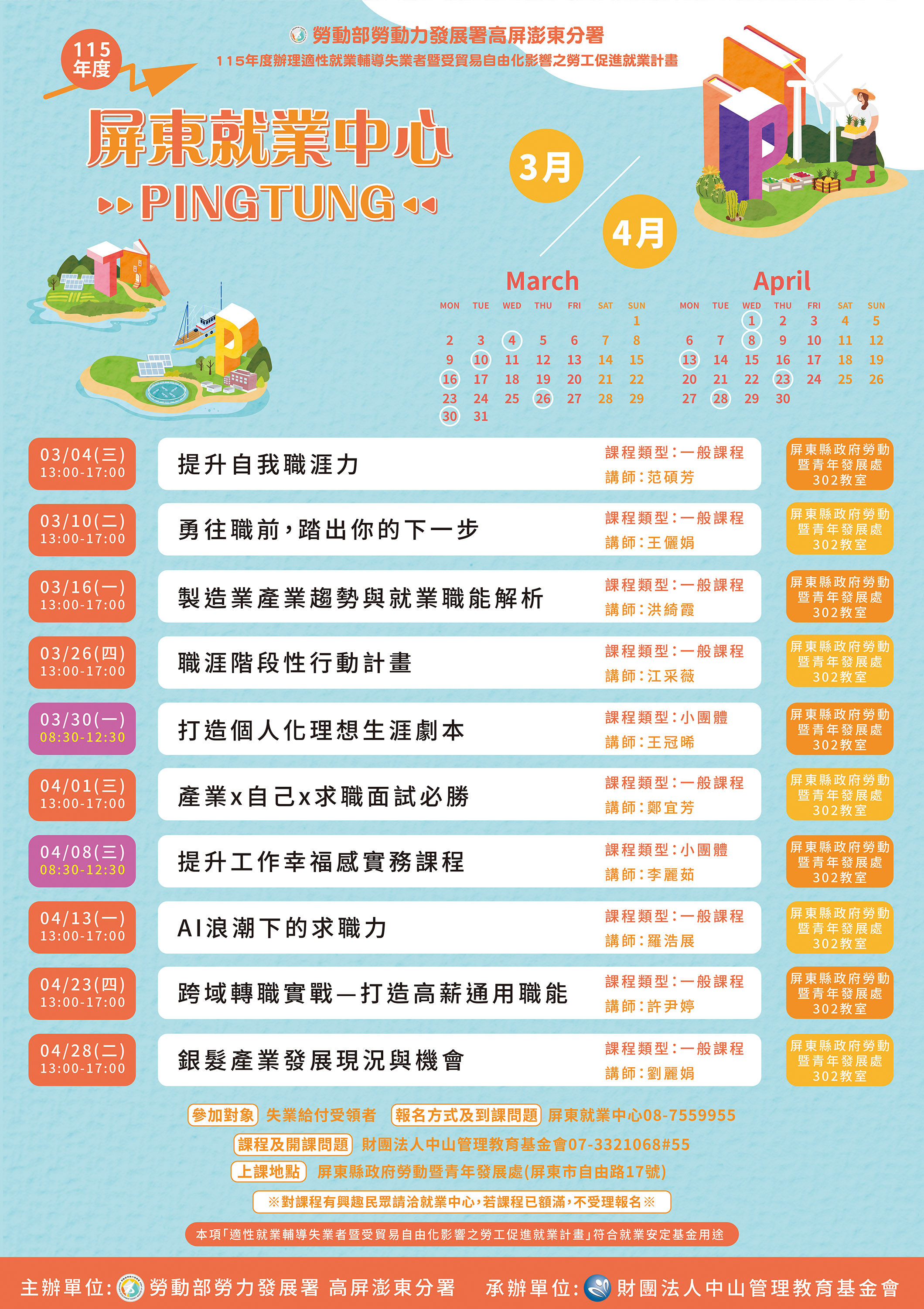 115年3月至4月共24場適性就業促進課程,於屏東、潮州、台東及澎湖等4個就業中心同步開跑,引領求職者職場再啟程,課程類別包含履歷與面試實作、就業準備與技能盤點、產業發展趨勢或行業說明等,高分署運用四大法寶,期盼能成為求職者們的職涯導航員,規劃及陪伴求職者累積實力、提升競爭力、增強自信心。
