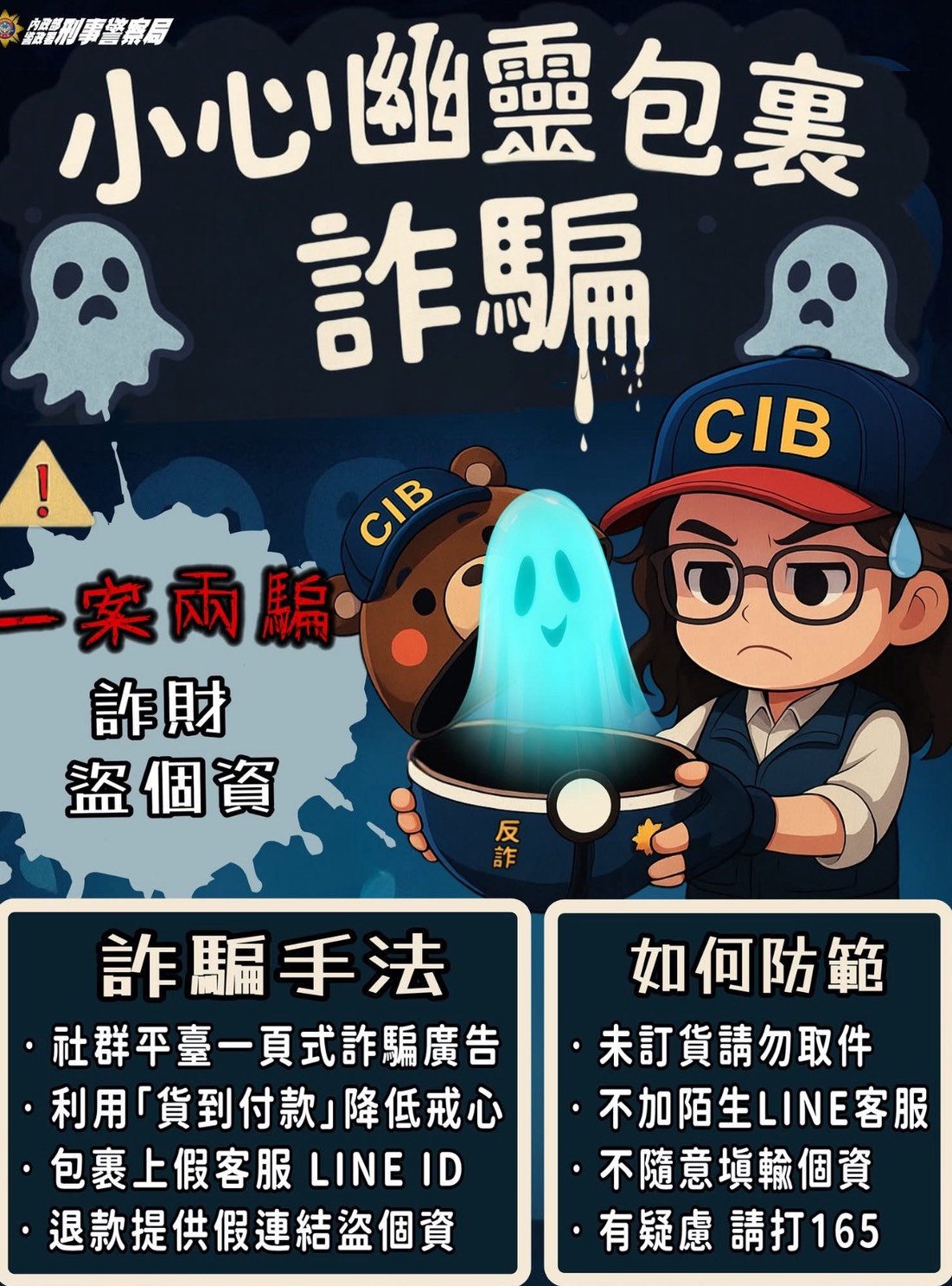 幽靈包裹詐騙又升級!你收到的不是驚喜,而是陷阱! 最近許多民眾收到「貨到付款的不明包裹」,外觀正常、金額不高,讓人以為只是誰寄錯──但打開後,真正的陷阱才開始! 詐騙集團會在包裹上寫上假 LINE 客服 ID加LINE聯繫包裹申訴、退貨退款,然而就被引導至假的一頁式網站 要求填姓名、電話、地址甚至信用卡資料,讓你「付一次錢,被騙兩次」! 記住: 未訂購的包裹,不要取! 不加陌生 LINE 客服 不點可疑網址、不要填個資 如有疑慮 →請撥打 165 反詐騙專線,一通電話拯救荷包 網路購物盛行,提高警覺,分享提醒更多朋友!