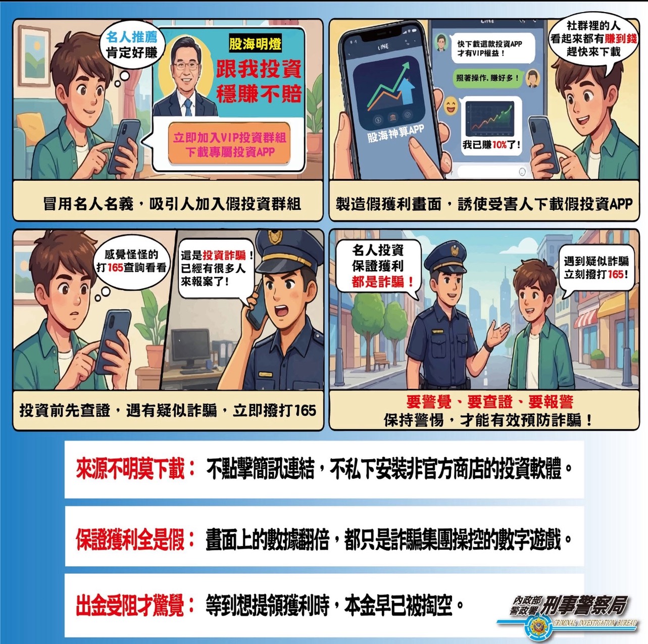 小心假名人投資群組詐騙: 詐騙集團常假冒知名投資人、財經名人或企業家,在臉書社團、LINE、Telegram等平台,以分享飆股、內線消息為誘因,一步步引導加入假投資平台或要求匯款。 請提高警覺:名人不會私下拉你進投資群組、保證獲利、穩賺不賠,一定是詐騙、要你轉帳、購買虛擬貨幣,立刻封鎖、投資前務必多方查證,不要衝動操作。