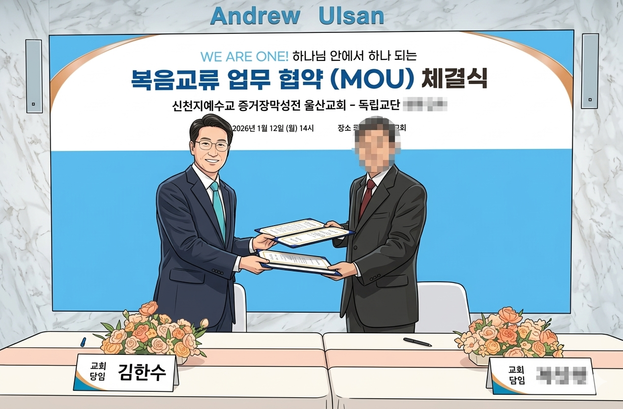 新天地蔚山教會於今年(2026)1 月 12 日,在新天地蔚山教會 3 樓與該獨立教派教會舉行新年首場福音交流 MOU 簽署儀式。雙方在儀式中承諾,未來將以聖經為共同基礎,推動話語交流與相互合作。