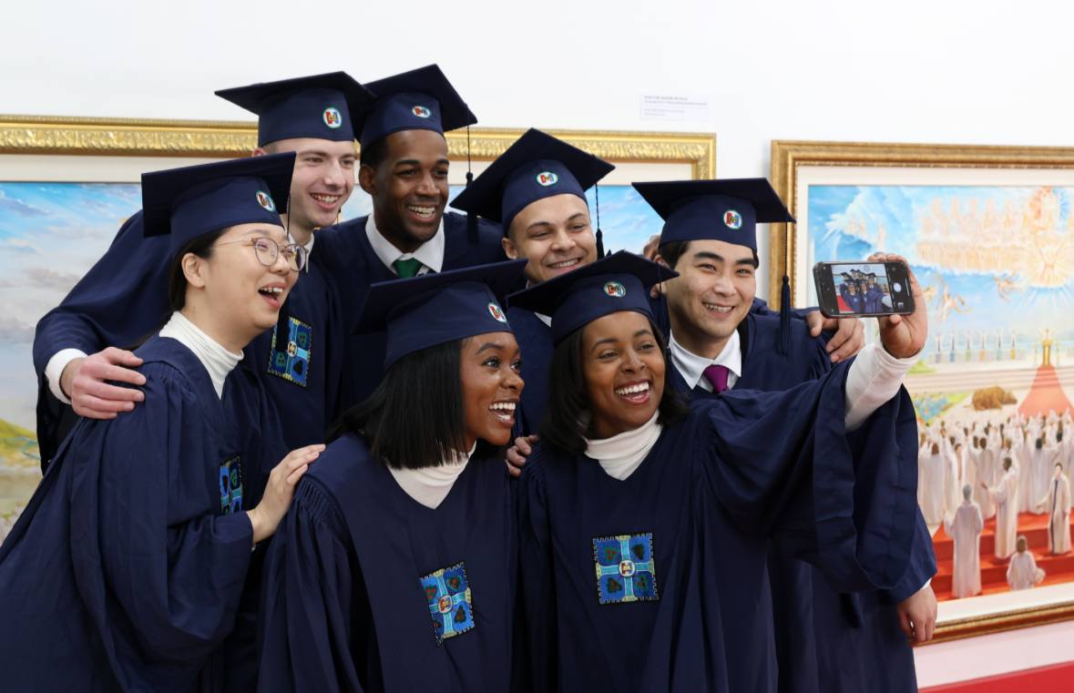 2025年11月2日於新天地耶穌教證據帳幕聖殿清州教會舉行的「錫安基督教宣教中心第116期結業典禮」中,結業生們互相祝賀彼此的結業並合影留念。【照片提供:新天地耶穌教會】