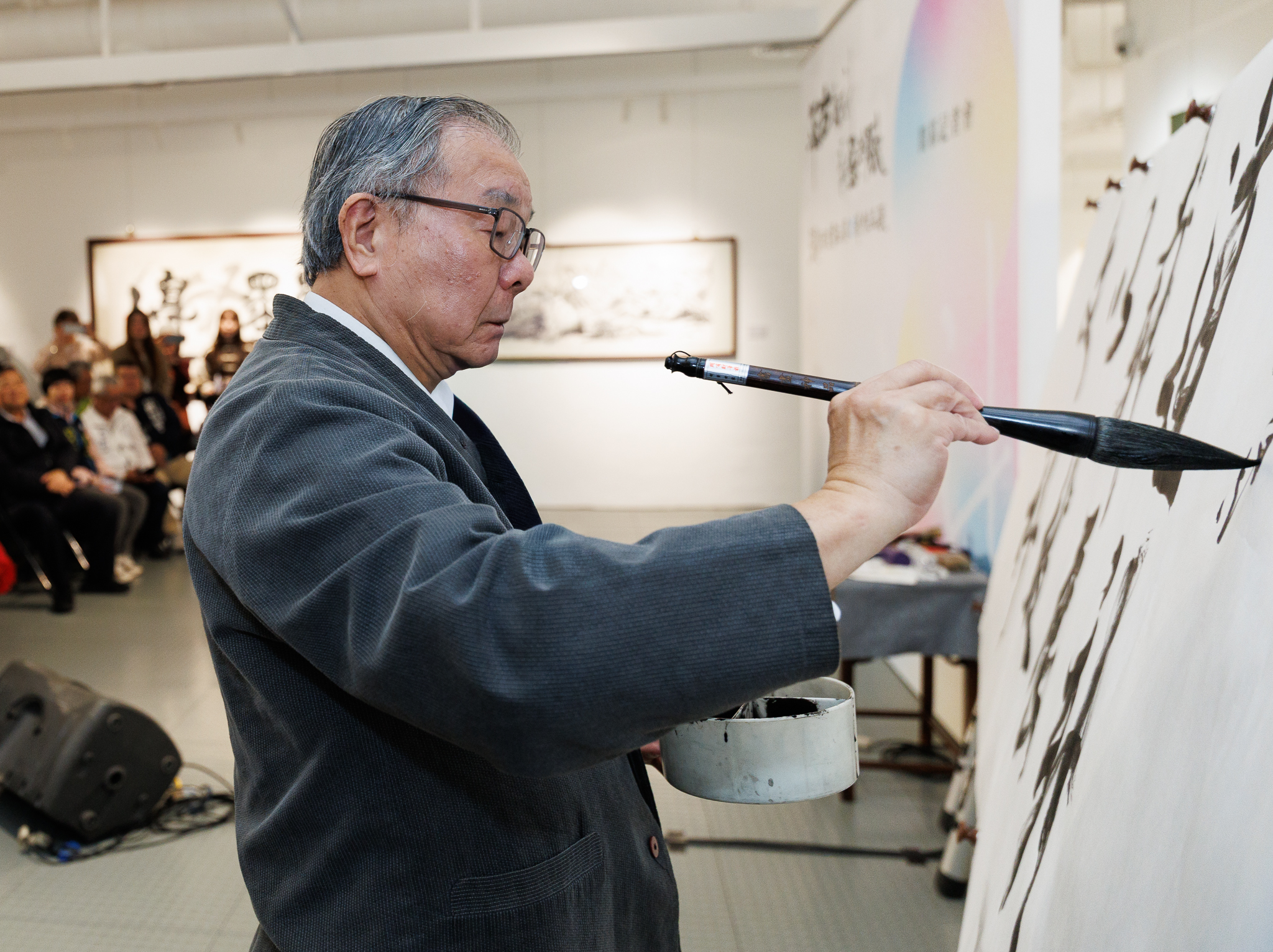 ▲圖/張炳煌教授現場揮毫「文」以載道「科」技展新 感謝新竹縣長楊文科對藝文發展的支持!(圖/億光文化基金會提供)